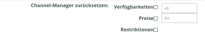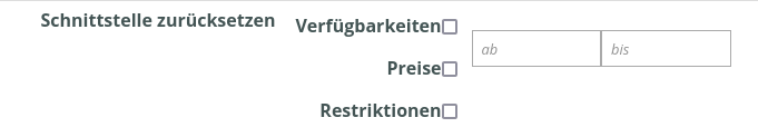 Wählen Sie bei „Schnittstelle zurücksetzen“ aus, was Sie zurücksetzen wollen (Verfügbarkeiten, Preise und/oder Restriktionen). Optional können Sie auch einen Datumsbereich auswählen, der zurückgesetzt werden soll. (wenn Sie die Datumsfelder leer lassen, werden alle buchbaren Tage zurückgesetzt.)